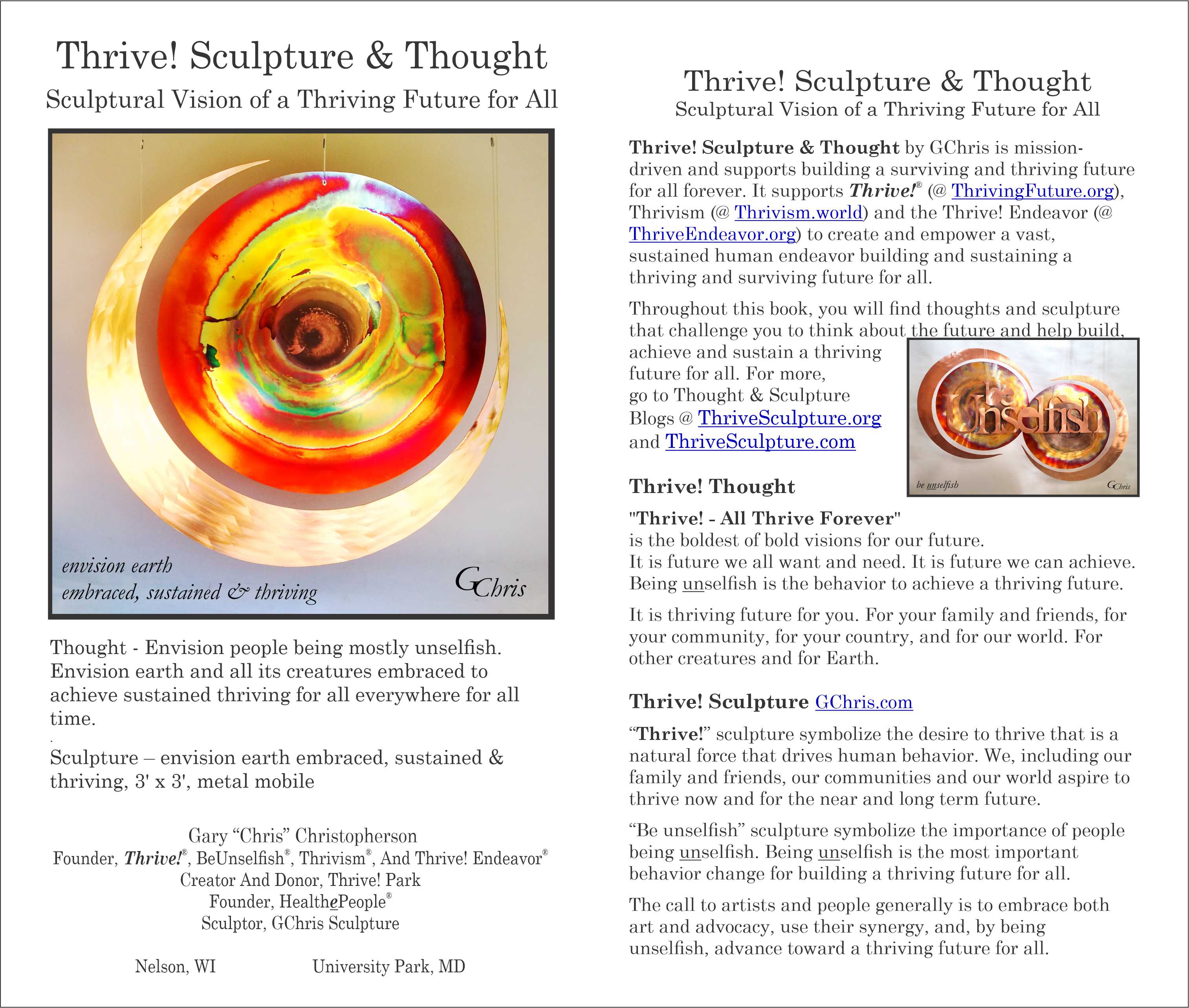 Sculpture Book - Thrive! Sculpture & Thought [Updated 2025] Nearly 200 sculptures and thoughts in art book available @ Amazon.com as paperback or Kindle book and free paperback download [large PDF] free eBook download [large PDF]. Throughout this book, you will find thoughts and sculpture that challenge you to think about the future and help build, achieve and sustain a thriving future for all. |