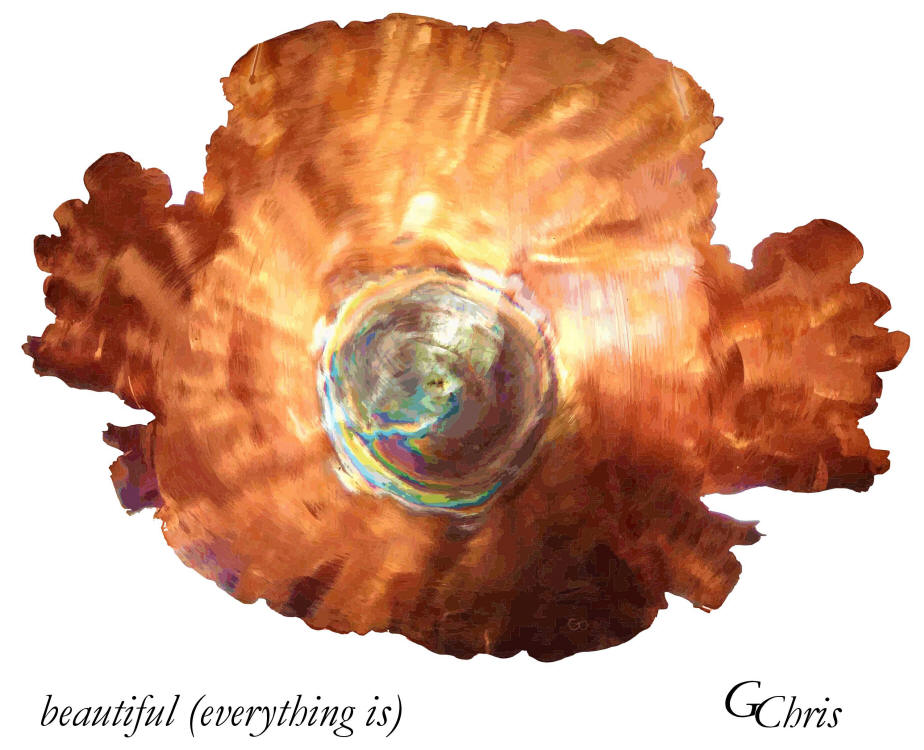 beautiful (everything is) 3' x 2' metal mobile Everything is beautiful when eyed in the eyes of a beholder. The only things not beautiful are those we choose to behold as not beautiful. In the eyes of the unselfish, all things are beautiful. |