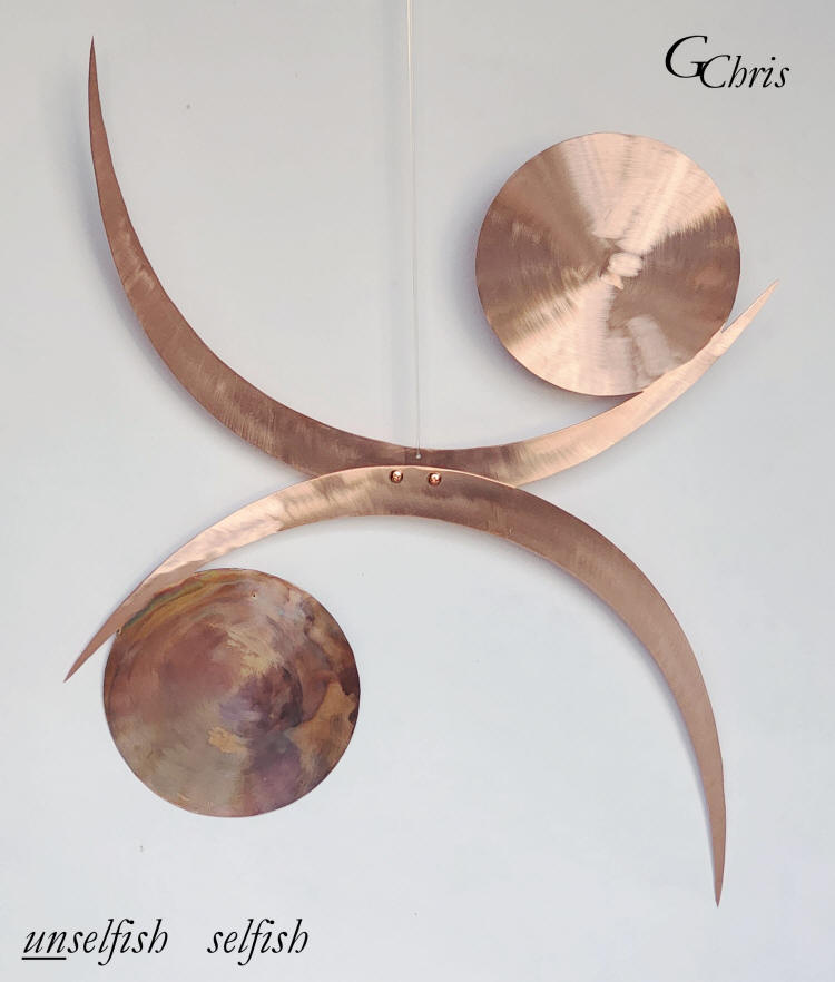 unselfish...selfish 3' x 3' metal mobile Our world today. Torn between being unselfish or selfish. Torn over whether our future will be a very bad future or a thriving future for all. We must choose to be unselfish if we all are to survive and thrive. Unfortunately, our current choice is mostly to be selfish. As a result, our world faces a very bad future. Instead, our choice must be to be unselfish. Then, and only then, will our world achieve a thriving future for all. |